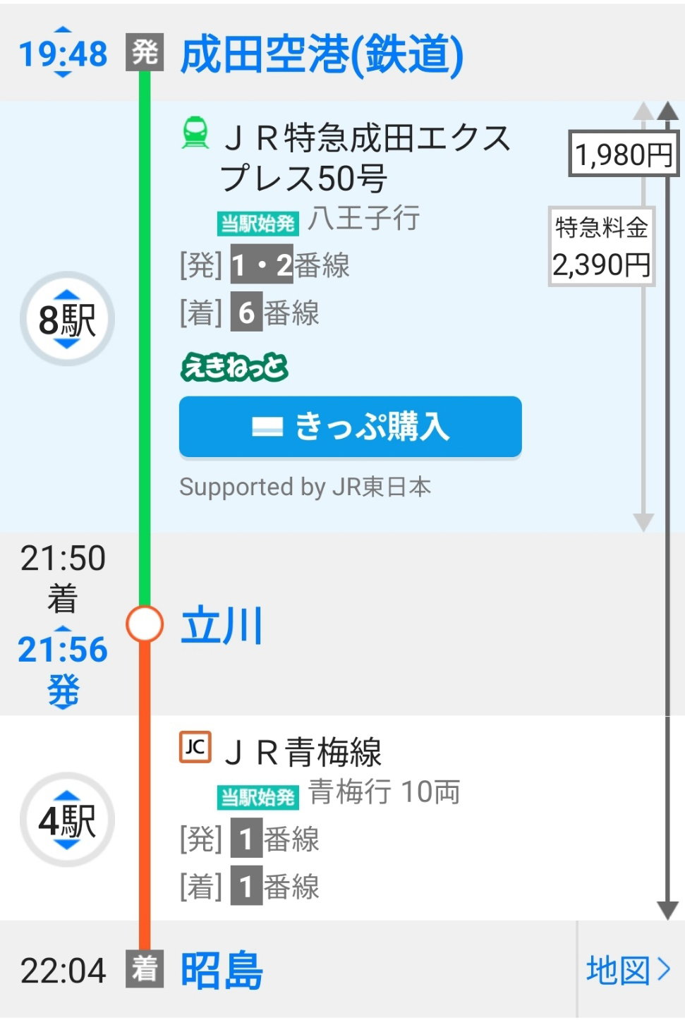 나리타공항 제2터널 지하에서 출발하는 나리타익스프레스 내부 다치가와 역까지 직통으로 1시간30분 소요, 요금은 나리타공항을 통해 입국하는 외국인 한해 왕복 4,000엔으로 일본 교통요금 대비 저렴하고 쾌적하였다.